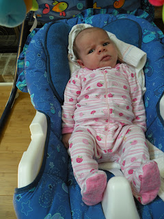 Today we headed to the doctor for Taylor's one month well-baby visit. Doctor said that everything looks good and she is gaining weight like a little champ! She is definitely long and skinny right now. She has outgrown her newborn size sleepers because she is just too long for them. She is still breastfeeding great and typically sleeping at least one 3 or 4 hour stretch at night, then wakes up twice to eat and goes back to bed for about 2 more hours each time. She is a fussier baby than Ella was and is pretty gassy at times, but we are learning her different cries and realizing when she is hungry, tired or just needs to burp.
